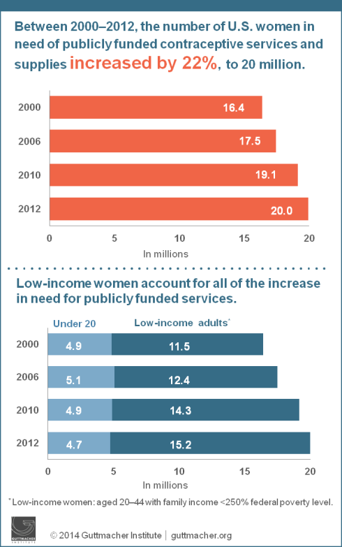 Between 2000 and 2012, the number of U.S. women in need of publicly funded family planning services increased by 22%, or 3.5 million women; in 2012, 20 million women were in need of publicly funded services. Women were considered to be "in need" if they were adults with a family income below 250% of the federal poverty level, or teens regardless of family income, and were sexually experienced and did not want to become pregnant. The increased need for publicly funded family planning services was driven primarily by a rise in the number of poor and low-income adult women (<250% of poverty) in need of contraceptive services and supplies.