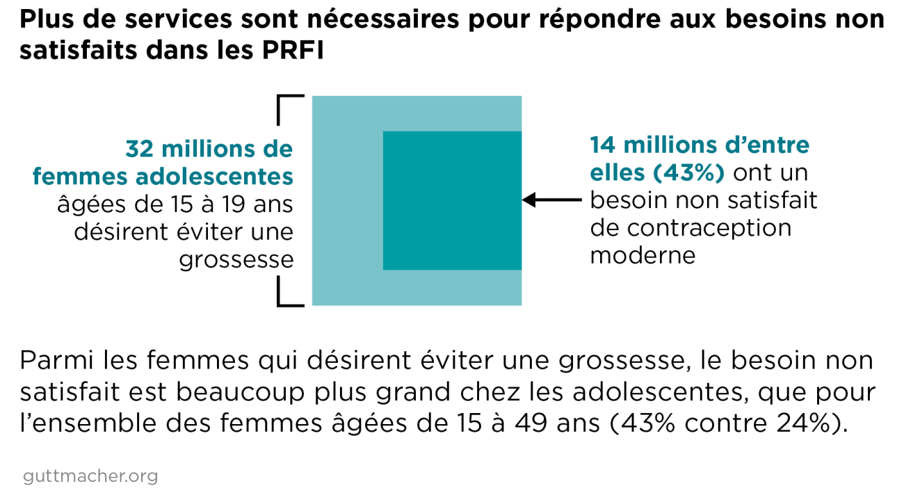 - Sur les 32 millions de femmes adolescentes qui désirent éviter une grossesse dans les PRFI, 14 millions présentent un besoin non satisfait de contraception moderne — en ce sens où elles désirent éviter une grossesse mais ne pratiquent pas la contraception moderne.