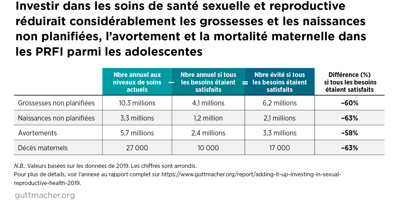 L’information présentée dans ce document peut être consultée dans Sully EA et al., Adding it Up: Investing in Sexual and Reproductive Health 2019, New York: Guttmacher Institute, 2020, https://www.guttmacher.org/report/adding-it-up-investing-in-sexual-repr….